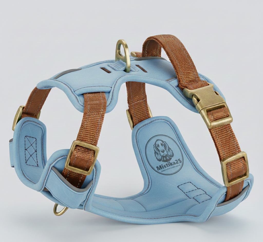 Un harnais en cuire bleu claire durable pour animaux de compagnie avec des sangles réglables